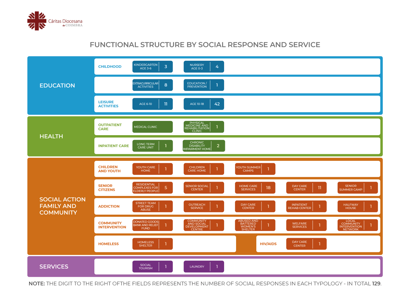 Cáritas Coimbra develops work connected to the support of disadvantaged people for several decades, with 1 social support centre, 1 social income program, 2 social canteens; 1 therapeutic community, 1 day care centre, 2 street teams and a social rehabilitation apartment for people with drug abuse problems, 1 centre for people with HIV, 1 centre for homeless people, 2 community centres, 1 reintegration community for women and 1 team for refugee integration supporting overall 8500 people each year.
